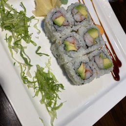 Temaki option: Avocado, cucumber, eel inside, draped with thinly sliced avocado. Served as a classic roll or hand roll.